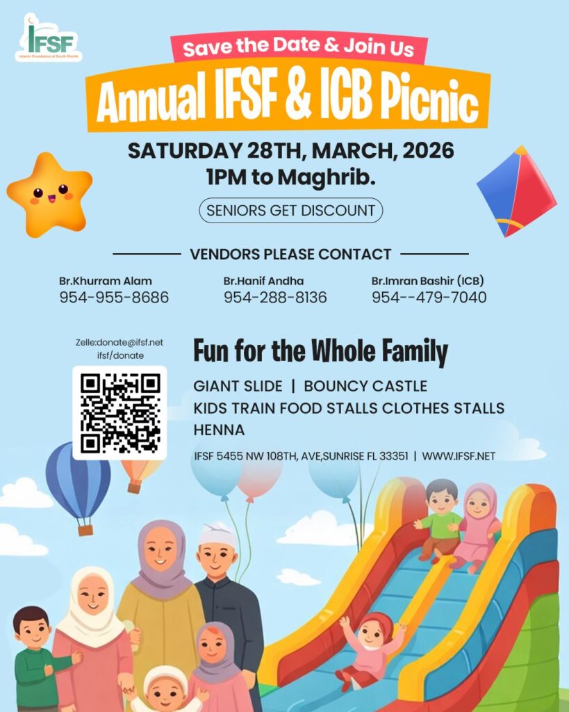 The Islamic Foundation of South Florida (also known as the School of Islamic Studies of Broward) is dedicated to the service of Allah (SWT) by serving the Muslim community. Our mission is focused on helping our community grow in faith and action through the dissemination of Islamic knowledge. This institution provides the Muslim families of South Florida with an infra-structure to raise their children in the Islamic way as prescribed by the Qur’an and Sunnah. This includes provision of a full-time school, part-time school and masjid facilities.